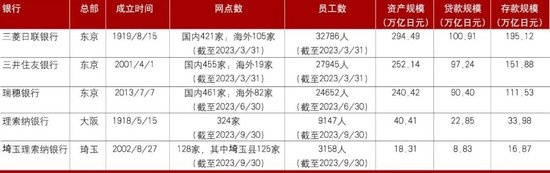 ① 日本银行业主要包括4家都市银行和104家地方银行,4家都市银行分别为三菱日联银行、三井住友银行、瑞穗银行、理索纳银行,都市银行以日本东京、大阪等都市作为总部,业务经营遍布日本全国,均为拥有大量存款资金的巨型银行。地方银行以日本各都、道、府、县内的中心城市作为总部,数量众多,大多数为所在地区的最大金融机构,但与都市银行相比规模较小,主要为本地区提供金融服务,对于区域经济影响力较大,一般担任地区主要企业的主要融资银行,规模较大的有横滨银行、静冈银行、京都银行、千叶银行等。