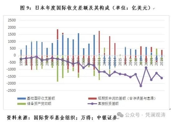 二是由于企业大量出海,日本国际收支口径的直接投资1996年以来呈现持续年度净流出的局面。随着2010年以来日本货物贸易差额变得不太稳定,造成日本基础国际收支波动较大。2012年以来的12个年份中,日本年度基础国际收支有一半年份为逆差,相关年份的平均逆差为545亿美元,较同期顺差年份的平均顺差396亿美元的规模高出37.7%(见图9)。