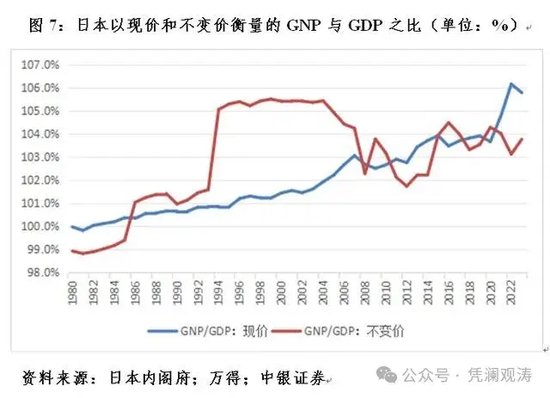 前述讨论的一个重要结论是,虽然上世纪90年代初以来,资产泡沫破灭后,日本经济陷入了长期停滞,GDP增长较慢,但由于日本企业上世纪80年代中期以来大量出海,GNP增长更快。根据日本内阁府的统计,从现价看,日本名义GNP从1982年起超过GDP,到2023年相当于GDP的105.8%,较1990年上升了5.2个百分点,其中,1991~2023年日本名义GNP年均增长1.04%,较同期名义GDP年均增速高出0.15个百分点;从不变价看,日本实际GNP从1986年起超过GDP,到2023年相当于GDP的103.8%,较1990年上升了2.8个百分点,其中,1991~2023年日本实际GNP年均增长0.76%,较同期实际GDP年均增速高出0.08个百分点(见图7)。
