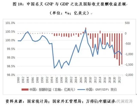 中国是全球仅次于日本、德国的第三大对外净债权国。由于对外资产有相当一部分是追求安全第一的官方储备资产运用,而对外负债主要是高成本的利用外商直接投资,中国投资收益常年为逆差,这对应着海外净要素收入为负。故1993年以来,除2007、2008和2014年外,其他年份的中国名义GNP均小于GDP。2023年,二者之比为99.2%,为2013年以来的新低(见图10)。