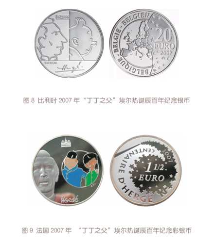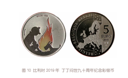 2007年,时逢埃尔热诞辰百年,比利时发行的纪念银币(见图8)正面左边为埃尔热侧像,右边为丁丁侧像。法国发行的纪念彩银币(见图9)正面左侧为埃尔热肖像,右边为头戴瓜皮帽、身着马褂的丁丁以及中国人“张”。2019年,比利时发行的丁丁问世九十周年纪念彩银币(见图10)采用阴影艺术,通过火焰描摹出丁丁和宠物狗“白雪”的身影。