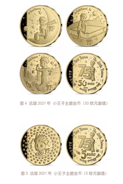 2021年,为纪念法文版《小王子》出版65周年,法国发行了面值50欧元、1/4盎司、三枚一套的小王子主题金币(见图4),正面图案分别为在月球上的小王子、坐在书上的小王子以及和狐狸一起跑步的小王子。另外,还发行了一枚面值5欧元的0.5克金币(见图5)和一枚面值200欧元的1盎司金币(见图6)。2023年,喀麦隆亦发行了小王子主题彩银币(见图7)。