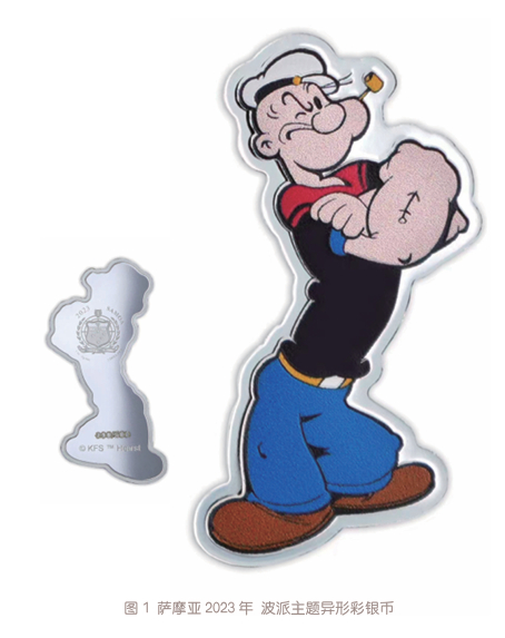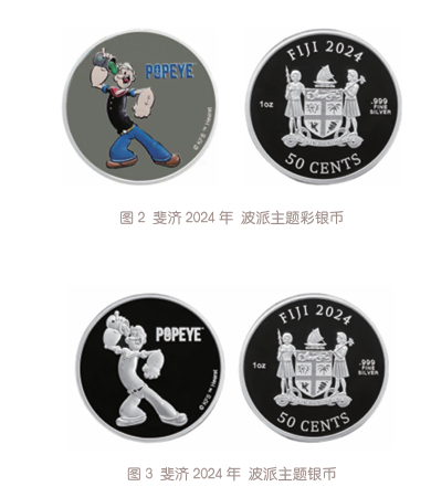 “嘿!你想要变得力大无穷吗?你想要变得身强体壮吗?那就去吃菠菜吧!”由于片中对菠菜罐头的夸张设定,自该片上映后,美国的菠菜销量提升了33%,波派也成为了“菠菜代言人”。2023年,萨摩亚发行了一枚波派主题异形彩银币(见图1)。2024年,斐济发行了两枚一组的波派主题银币(见图2、图3),其中一枚为银币,一枚为彩银币。