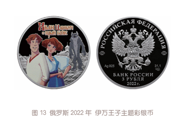 俄罗斯曾于2011年拍摄同名动画电影《伊万王子和灰狼》,并于2022年发行了相关主题银币(见图13),币面印有伊万王子、叶列娜和灰狼。