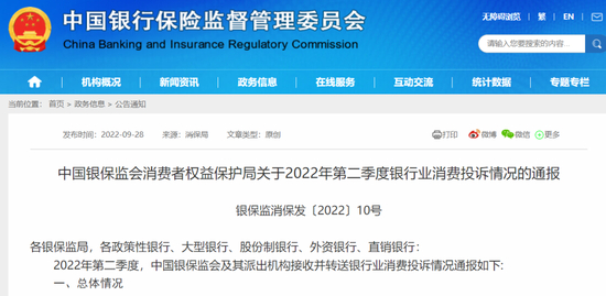 今日,中国银保监会消费者权益保护局发布了关于2022年第二季度银行业消费投诉的通报,披露了银行信用卡业务、个人贷款业务最新投诉情况。
