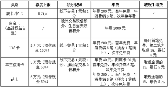 盛京银行官网显示,该行信用卡产品包括靓卡、白金卡、U18卡、车主信用卡、萌卡、忆卡等多种类型,基本信息如下: