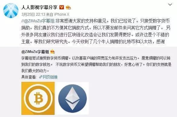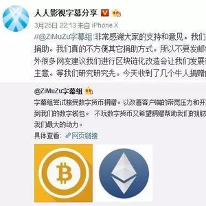 一个月前,人人字幕组对外表示为了改善客户端的带宽压力和开发支出压力,开始接受捐赠了,但仅限于接受加密数字货币的捐赠。