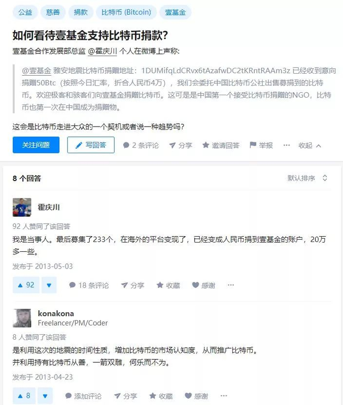 同样是慈善捐款领域,壹基金也在 2013 年开放了比特币捐款入口,为雅安(芦山)地震赈灾募捐,两天之内就募捐到了价值约人民币 5 万元的比特币。时任壹基金合作发展部总监的霍庆川之后在知乎上表示,当时一共募集到 233 个比特币,在海外平台变现为约 20 万人民币。