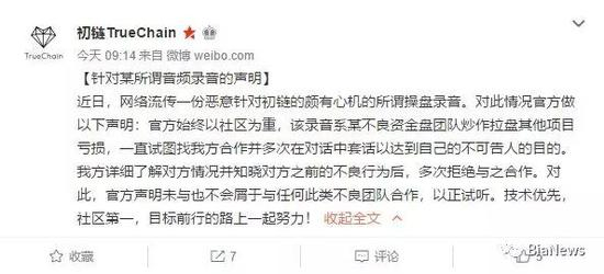 今日上午,初链官方微博也发声明称,操盘录音是不良资金盘团队炒作拉盘其他项目亏损后,找初链合作并在对话中套话所得。