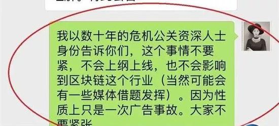 “我以数十年危机公关资深人士身份告诉你,这个事情不要紧,不会上纲上线,也不会影响到区块链这个行业(当然可能会也一些媒体借题发挥)。因为性质上是一次广告事故。大家不要担心。即便被罚款,一定程度上是好事情,因为这个大活动宣传度上去了。当广告费吧,况且还不一定有罚款。”论坛群中备注为吴娟的这一说法得到博鳌群里人的普遍认同。