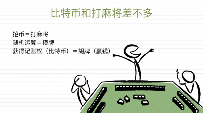 我们打麻将不就是不断地去摸牌打牌,最终胡牌的一个过程吗?四个“矿工”一组,最先从144个随机数字中,一人一次摸牌机会,碰撞出一组牌,谁先胡了谁就赢了,获得收益,也获得记账权。