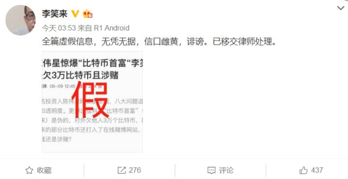 李笑来坐不住了,如果媒体舆论再向李笑来施压,极有可能被有关部门请去喝茶。6 月 10 日凌晨,李笑来在微博表示陈伟星所言为虚假信息,无凭无据、信口雌黄,涉及诽谤,并且已移交律师处理。
