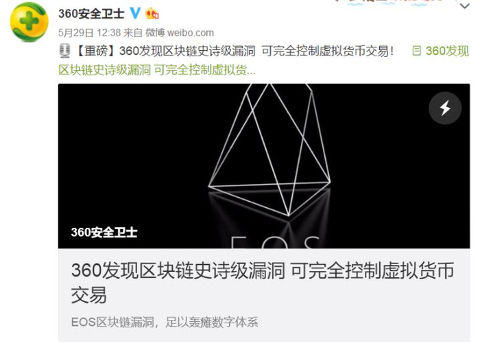 5 月 29 日,一个平静的上午之后,360 安全卫士团队发布了《360 发现区块链史诗级漏洞 可完全控制虚拟货币交易》,此新闻一出 EOS 价格暴跌 7%。