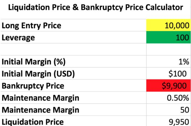 一名投资者将 100 美元作为价值 1 万美元的 100 倍杠杆多头头寸的保证金,其爆仓价格被定在 9900 美元,即市场价格减去保证金。