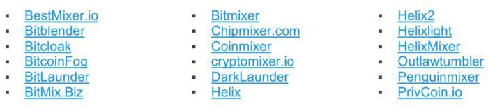 现在有不少团队和公司提供虚拟货币洗钱服务,在网上可以通过mixer、tumbler、fogger、landries等关键词检索到。他们会从不同的客户手上收取资金,然后将他们混合在一起,再将混合后、洗白的资金还给客户。