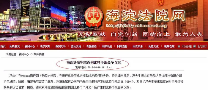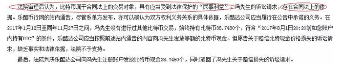 最终,海淀法院判决乐酷达公司向冯先生注册账户发放比特币现金38.7480个,但同时驳回了冯先生要求赔偿16万余元价格损失的诉讼请求。