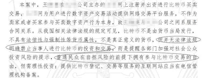 法院同时认为,从我国相关法律法规的规定可见,比特币不是由货币当局发行,不具有法偿性与强制性等货币属性,不是真正意义的货币,但并无法律法规明确禁止当事人进行比特币的投资和交易,而是提醒各部门加强对社会公众投资风险的提示,普通民众在自担风险的前提下拥有参与比特币交易的自由,但需理性投资。