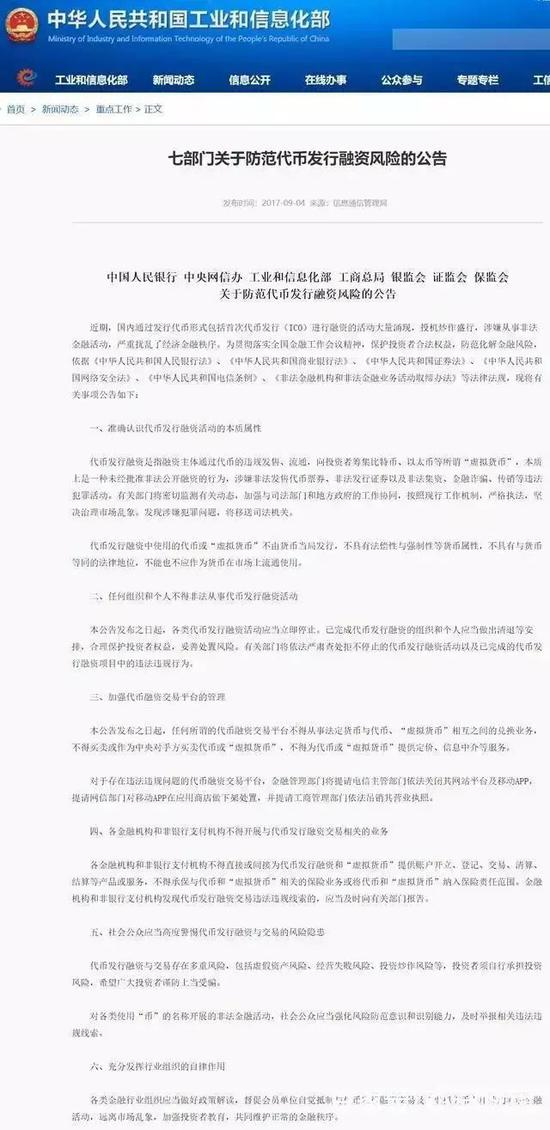 2017年9月4日下午3点,央行在其官网公布了一个重磅消息,取缔ICO,这个公告,是中国人民银行、中央网信办、工业和信息化部、工商总局、银监会、证监会、保监会联合发布的——《关于防范代币发行融资风险的公告》。公告给ICO作出了定性: