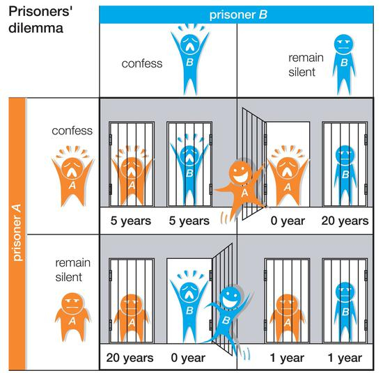 该理论阐述的是一个关于信息不对称情况下相互信任的问题。两个共谋犯罪的人被关入监狱,不能互相沟通。如果两个人都不揭发对方,则由于证据不确定,每个人都坐牢一年;若一人揭发,而另一人沉默,则揭发者因为立功而立即获释,沉默者因不合作而入狱二十年;若互相揭发,则因证据确实,二者都判刑五年。由于囚徒无法信任对方,因此倾向于互相揭发,而不是同守沉默。