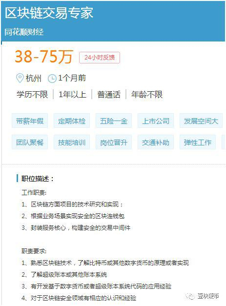 硬币君注意到,公开的招聘信息显示,A股上市公司同花顺当前正在招聘的职位包括了“区块链交易专家”,开出的年薪最高达75万。该职位的关键信息包括:熟悉比特币的原理、实现安全的区块连钱包、构建安全的交易中间件等。
