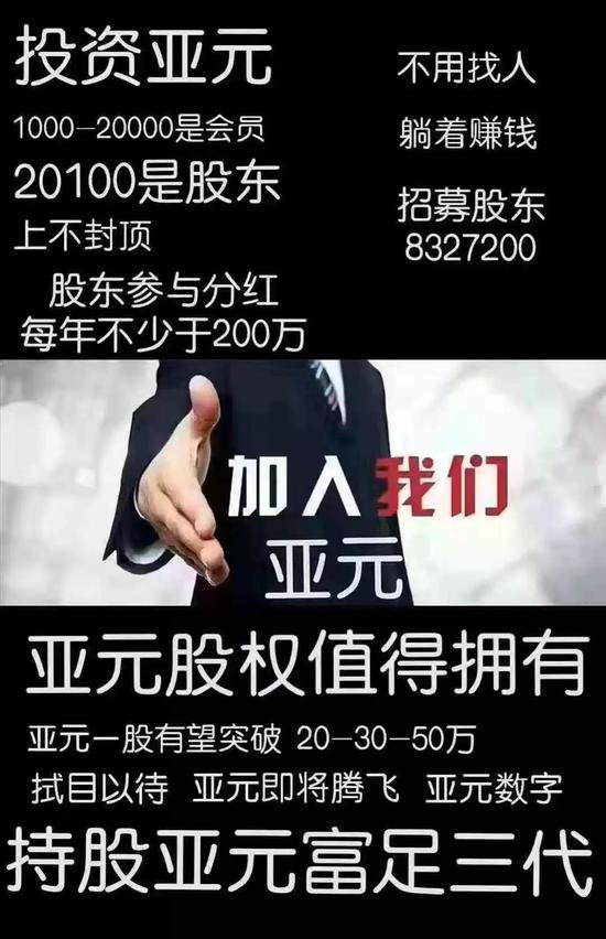 而福建漳州靖城的一处饭店内,卢玉和正慷概激昂地给店内的几十名会员讲述“亚元”的运作模式。“十年打工一场空,三年网络成富翁”,卢玉和告诉他们:亚元就是大家的机会。