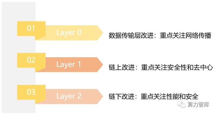 Layer1层链上改进是将区块链技术底层账本和上层应用分离,底层账本的重心放在安全性和去中心化上,在性能上有所取舍。