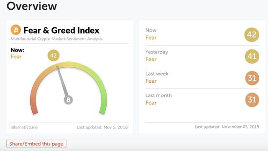 当前市场的恐惧与贪婪指数为42,指数较昨日略有上升。
