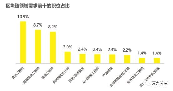 据《2018区块链人才供应和发展研究报告》统计,需求前十的区块链岗位中,算法工程师和软件工程师是紧俏岗位,但供给端基本空白。