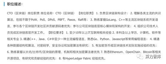 据算力智库记者通过招聘网站调研发现,大多数区块链企业对CTO的基本要求是掌握C++/Java/Go/Python等主流编程语言,还需要对密码学、共识算法、超级账本、智能合约、数据结构等有足够认识,至少10年以上IT互联网相关经验。