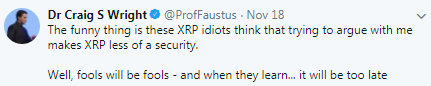 为了蹭热度,澳本聪花式发推,从18日期起,共发送10多条关于XRP的推特,目测还将持续:一会儿说“XRP是加密领域最大的骗局”