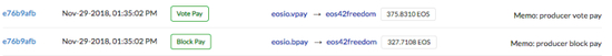 而从 EOS 浏览器上查,EOS 42 的实际投票奖励是略多一些的。11 月 29 日的奖励是 375 个 EOS。差异就是因为投票奖励池子总量不同。