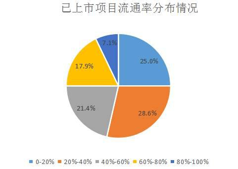 流通率代表项目方已释放的token的比例,可以在某种程度上可以衡量砸盘风险的高低。在28个上所的项目中,流通率的分布区间为1.4%-100%,平均流通率为46.65%,流通率分布情况如下图,其中20%-40%区间的项目最多。