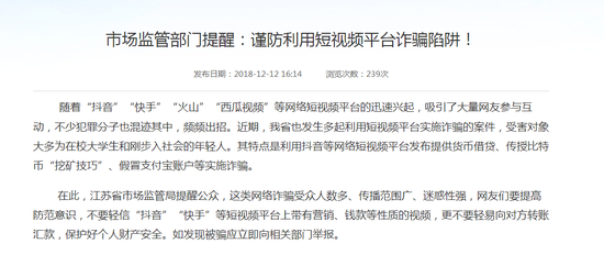 江苏省市场监管局于12月12日发布提醒称:近期,江苏省发生多起利用短视频平台实施诈骗的案件,其特点是利用抖音等网络短视频平台发布提供货币借贷、传授比特币“挖矿技巧”、假冒支付宝账户等实施诈骗。