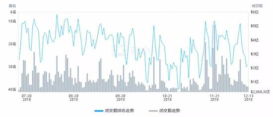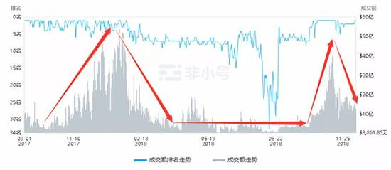 另外一家交易额日均交易量在90亿人民以上的交易所Bithumb,其交易量在今年一月间陡然下跌以后,一直保持在相对比较低的位置,直到今年10月12日的时候陡然增加。