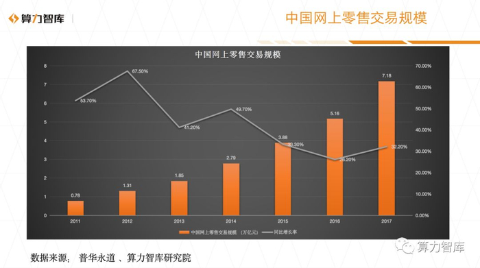 根据国家统计局统计,2018年上半年,全国网上零售额达到4.08万亿元,同比增长 30.1%。其中,实物商品网上零售额为3.13万亿元,同比增长29.8%,高于同期社会消费品零售总额20.4个百分点,占社会消费品零售总额的比重为17.4%,对社会消费品零售总额增长的贡献率达46.4%,对消费的拉动作用进一步增强。