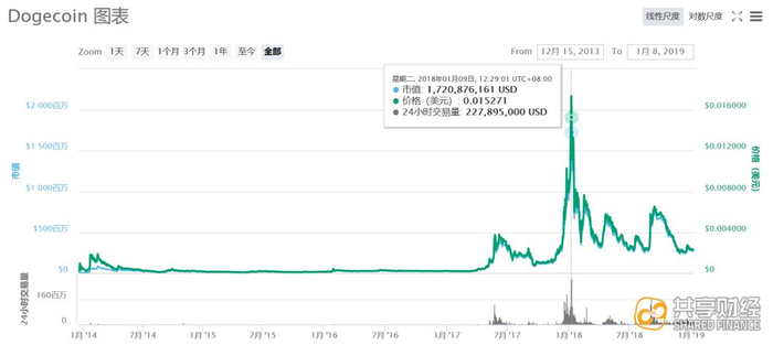 根据加密货币追踪网站Coinmarketcap的实时数据显示,今天狗狗币的价格在0.0023美元附近徘徊,市值较2018年1月9日的最高17亿美元已经下跌到2.68亿美元。同大多数其他币种一样,一年时间,跌幅超过了80%。