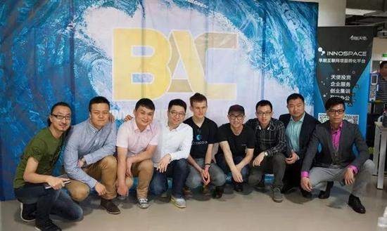 NEO早期投资人与V神合影,左一王冠,左二Kaku,左三大头,左四达叔,中间V神,右一蓝领,右二 初夏虎,右三徐义吉,右四巨蟹刘嘉陵