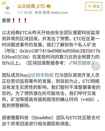 与此同时,以太经典ETC也发微博,证实有私人矿池(地址:0x3ccC8F7415e09BEAd930dc2B23617bD39ceD2C06)在某些时间的算力达到全网算力的50%以上。并表示,其团队成员Roy(ETC中国社区负责人)已与团队其他开发人员正在密切监视事件的发展,到目前为止,ETC网络没有发生实质性的影响,“我们暂时不清楚肇事者的目的。为了预防潜在的可能攻击,我们呼吁交易所,矿池等提高充值和提现的确认时间(+400),直到预警解除。”