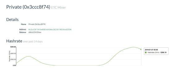 据记者了解,参与ETC挖矿的矿池算力在1月6日出现了大幅波动。Private Pool(0x3ccc8f74的开头的私人挖矿地址),最近一周在ETC上投入的算力平均在300GH/s以下,但在1月6日13点左右,突然飙升至了3263GH/s,短时排名第一。回归常态后,今日早间6点,该矿池算力再次大幅拉升,最高达到了4723GH/s,超过了其他矿池投入的算力总和。
