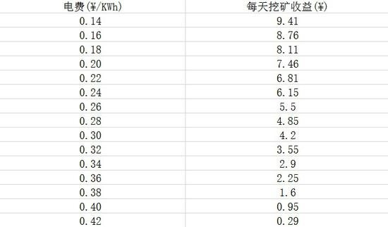 挖矿收益随电费增加而快速下降,当电费达到0.45元/KWh时,挖矿收益为负