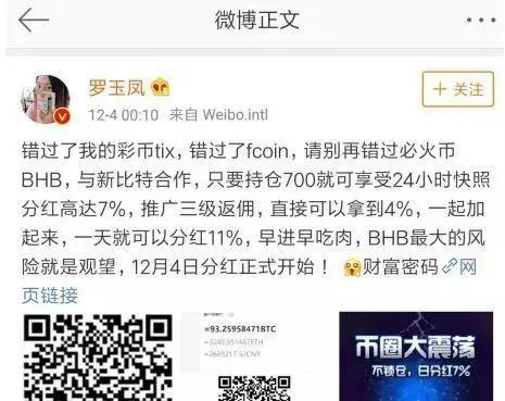 在推广宣传方面,BHB项目更是不余遗力,大漠本人亲自在一直播为用户做推广宣传。凤姐在微博为BHB代言,在该微博的最后,不仅贴上了交易所的链接,更是有惊人之语“再说一次BHB最大的风险就是观望”。由于受到媒体的热议,当日凤姐推广的BHB原微博也被凤姐删除。