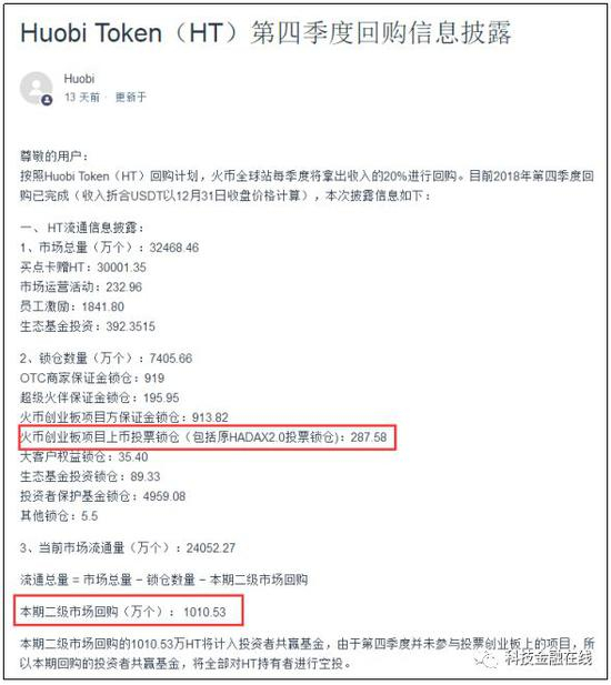 四季度火币回购1010.53万个HT,2019年1月1日-15日间,HT价格约为1.03USDT,可以计算出回购共付出1040.846万USDT,依次可以推算出四季度火币全部收入约为5204.230万USDT,也就是5204.230万美元。