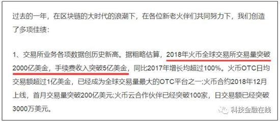 1月24日,火币创始人李林发出题为《不忘初心,砥砺前行!》的火币全员信,全员信披露2018年火币全球交易所交易量突破2000亿美金,手续费收入突破5亿美金。但是科技金融在线调查发现,实际情况并非如此,2018年火币交易所手续费收入和投票上币费用,(以下所说火币收入除非有约定,均指两项总和)约在3.8亿美元左右,而且呈现断崖式下滑状态。