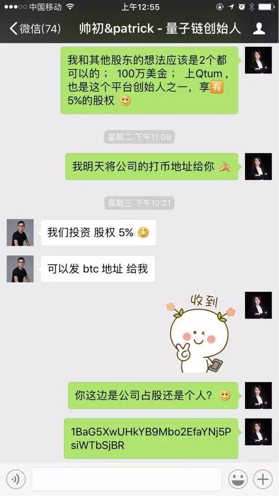 另一名新纪元的早期员工罗峰(化名,已离职)提供了一些聊天截图。截图显示,朱波、初夏虎、邓迪都曾出现在名为“新纪元内部群”的群聊中;另一张私人聊天截图中,帅初对许琳说,“我们投资股权5%,可以发BTC地址给我。”随后,许琳将地址发了过来。