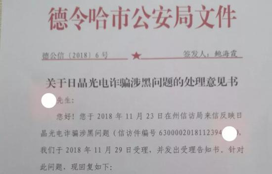 在投资人举报日晶涉黑后,2018年12月11日德令哈市公安局出具《关于日晶光电诈骗涉黑问题的处理意见书》确认三方协议为伪造,并已立案将对犯罪嫌疑人曹全福采取刑事强制措施。
