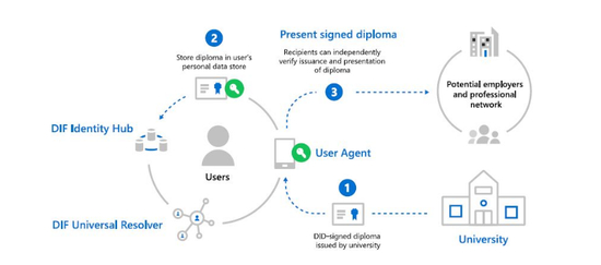 2018年2月,微软发布一份名为《分布式数字身份和区块链:我们所看到的未来》的公告,称在过去的一年中已经利用区块链技术来设计新型的数字身份,用以增强个人隐私、安全,以及控制。
