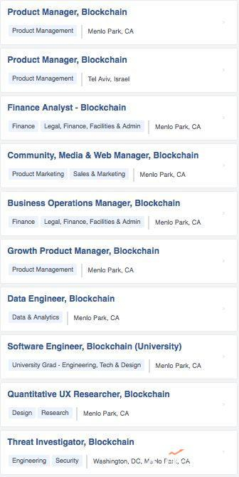 Facebook开放了差不多20个区块链职位,比公司招聘网站上列出的区块链职位略微少了一点。