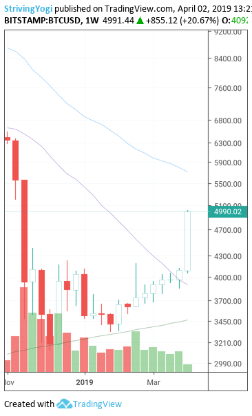 疯狂的比特币又回来了!周二(4月2日)亚洲时段午间,据Bitstamp报价显示,比特币半小时内拉涨逾800美元,突破5000美元关口,日内涨幅超20%。