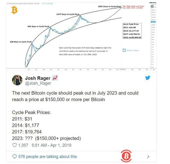 加密货币技术分析师兼投资者乔什·拉格(Josh Rager)表示,基于比特币自2011年以来的价格走势,以及比特币从历史高点后的回调中反弹的模式,他认为比特币在2051天内,即2023年之前,会达到一个新的峰值。
