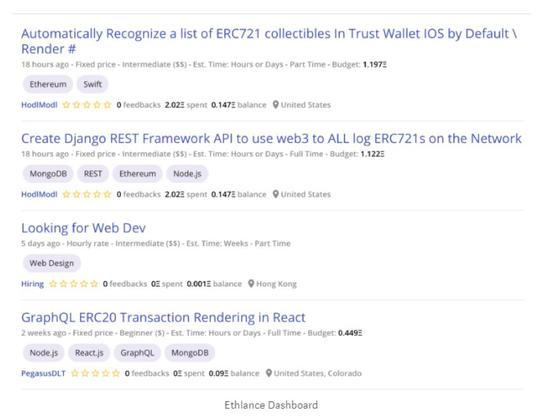 Ethlance是一个基于以太坊的求职招募系统,也是由 District0x 开发的。该系统允许用户创建雇主资料,罗列并申请开放工作机会、提供雇主排名和雇主评价反馈、还能发送/接收发票。